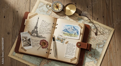 Travel Journal with Map, Compass, and Vignettes on Wooden Table