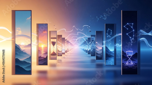 A visual journey through time and space, blending natural landscapes with cosmic constellations and hourglass symbols.
