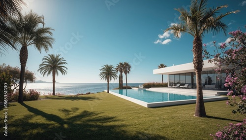 Summer vacation setting featuring seaside lodgings and sunny weather, suitable for travel promotion