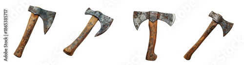 Four weathered hand axes with wooden handles are displayed showcasing a vintage aesthetic on transparent background