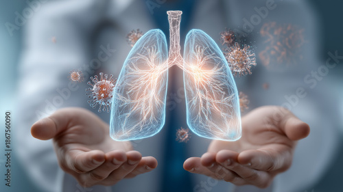Cyfrowe hologramowe płuca w dłoniach lekarza – choroby układu oddechowego i wirusy