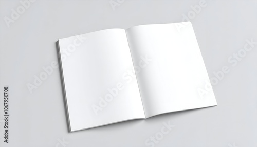 Open blank magazine with crisp white pages, centered on a light gray surface