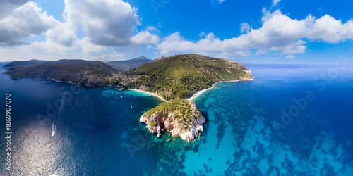 Aerial Panorama of Stafylos and Velanio Beaches divided by a Rocky Cape , turquoise Mediterranean Sea Skopelos Island Greece