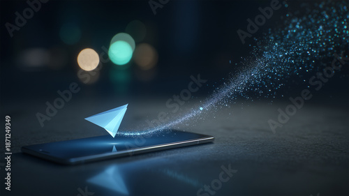暗い卓上、スマホ上に青く発光する紙飛行機アイコンが浮かぶ