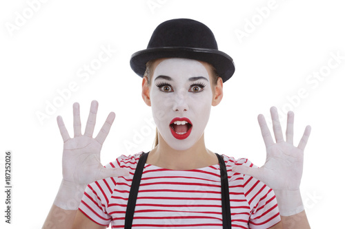 jeune fille mime maquillage blanc théâtre mimant la surprise