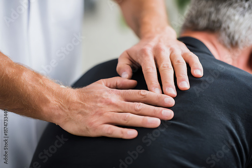 Professional physical therapist's hands examining a senior patient's upper back and shoulder.