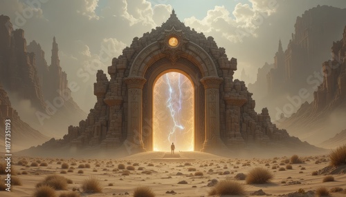 Ancient desert gateway with lightning storm and mysterious figure
