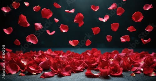 Red rose petals falling, scattered on surface. Dramatic lighting creates romantic mood. Dark background emphasizes vibrant color.