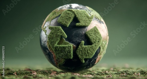 A green Earth with mossy landmasses and a recycling icon representing sustainability