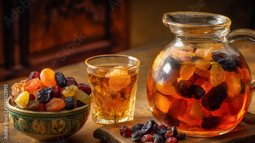 Kompot z suszonych owoców w szklanym dzbanku i szklance obok miseczki z bakaliami.