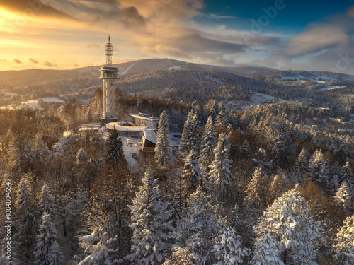 Lot wokół nowej wieży widokowej na Górze Parkowej w Krynicy-Zdroju zimą.