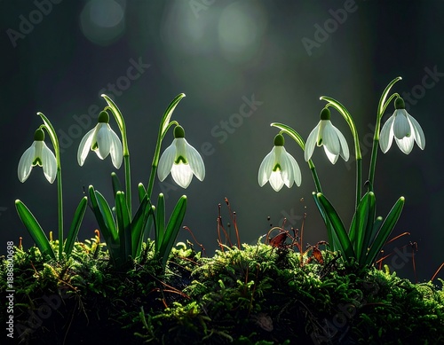 Sylwetki wiosennych roślin, przebiśniegów podświetlone od tyłu światłem słonecznym rosną w lesie otoczone mchem