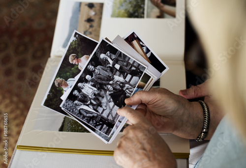 Senior couple looking at family photo album