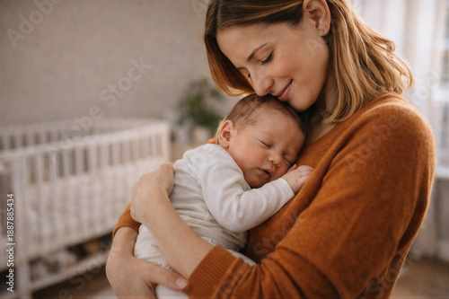 Matka tuląca śpiące niemowlę w domowym wnętrzu