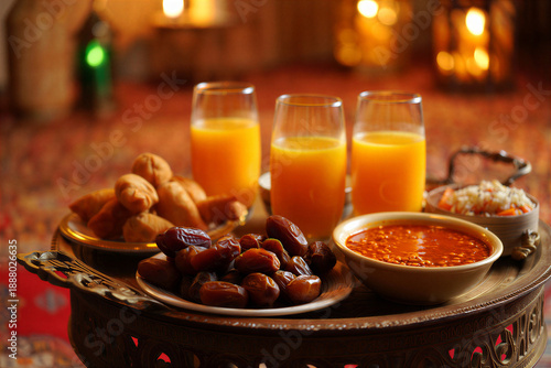 Ramadan, eid, iftar Traditional Middle Eastern Iftar spread featuring dates juice pastries and dip served on ornate platter with glowing lanterns background