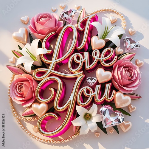 A beautiful arrangement of flowers and hearts with the words I Love You