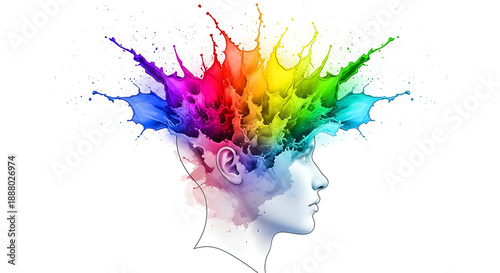 Burst of colorful paint from human head, visualizing brainstorming, new ideas, and creative thought