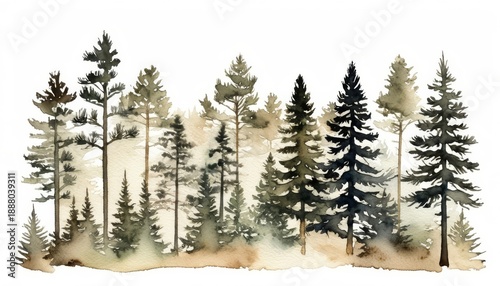 Watercolor pine forest silhouettes in soft muted tones