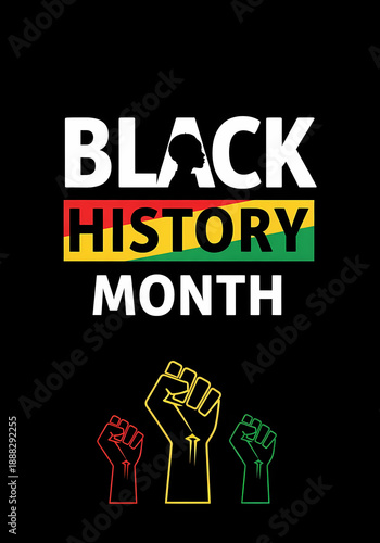 Black History Month text is centered above three outline drawings of raised fists colored red, gold, and green on a black background.