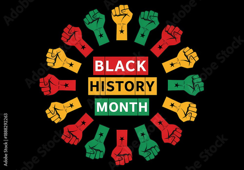 A circular arrangement of raised fists in red, green, and yellow surrounds central text celebrating Black History Month on a black background.