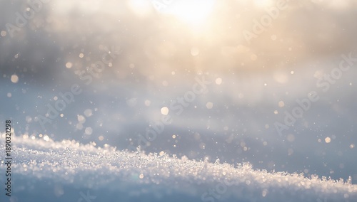 Glittering fresh snow crystals catching warm low sun on snowy field, with bokeh flares