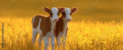 Joyful twin calves playfully romp in a radiant yellow field bathed in golden sunlight