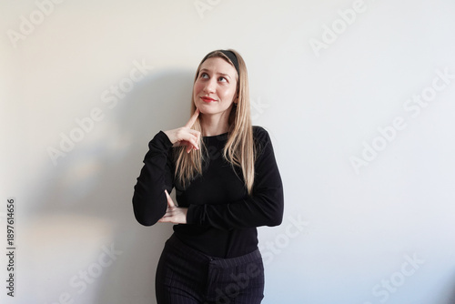 Młoda kobieta z dłonią na brodzie patrzy w górę, wyrażając zamyślenie i proces podejmowania decyzji.