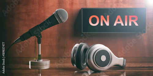 ON AIR written on a black box, headphones and a microphone. 3d illustration