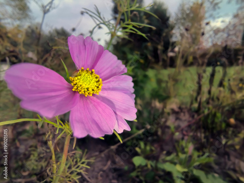 Jasnofioletowy kwiat Cosmos bipinnatus rozkwitł w pełnym rozkwicie w słoneczne październikowe popołudnie. Jego delikatne płatki otaczają jaskrawożółty środek, kontrastując z rozmytym tłem zielonym.