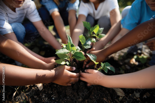 A group of diverse children joyfully planting young plants in soil, showcasing teamwork and the importance of nurturing nature for a sustainable future.