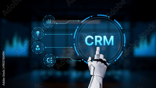 A robotic hand interacts with a vibrant holographic CRM system, showcasing the intersection of technology and business solutions in a modern office environment. Synapse