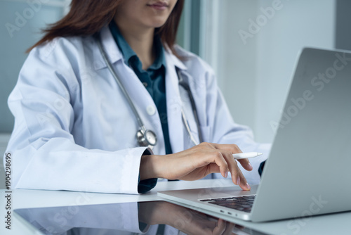 Close up, doctor working on laptop computer with digital tablet on office table. Female doctor searching the patient health information, using laptop and tablet. healthcare and medicine concept