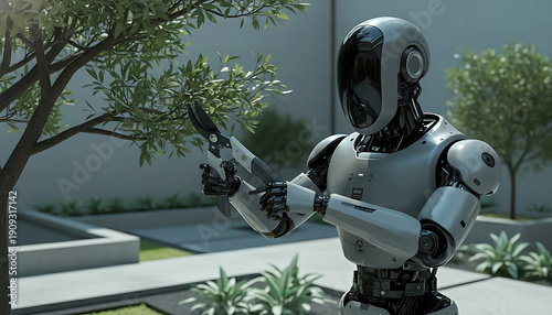 A Robot Trims Tree in Outdoor Garden Space