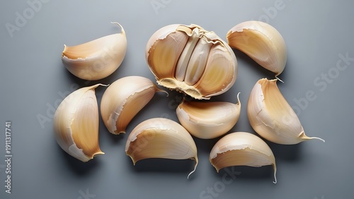 Aromatic garlic cloves arrangement on subdued background with close-up focus