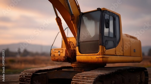 Close up of a yellow construction excavator at sunset with soft light on a dusty site