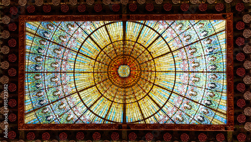Light streams through a Barcelona stained glass ceiling.
