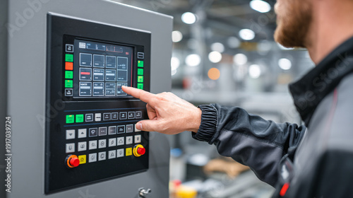 Person operating an industrial control panel with touchscreen interface.