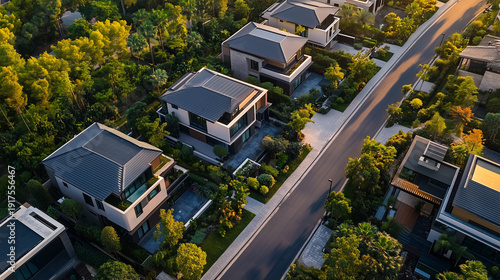 Top-down aerial view of modern residential neighborhood with green gardens