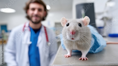 Curious rat in veterinary clinic with caucasian male veterinarian in background
