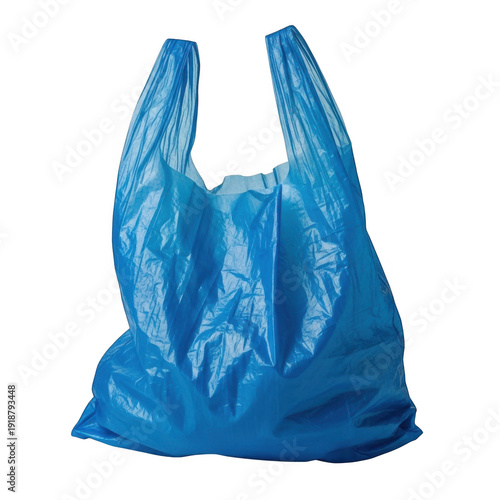A bright blue plastic shopping bag hanging on a hook or stand