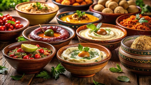 Experience the rich flavors of the Middle East with a selection of warm, savory appetizers and dips presented in traditional ceramic bowls