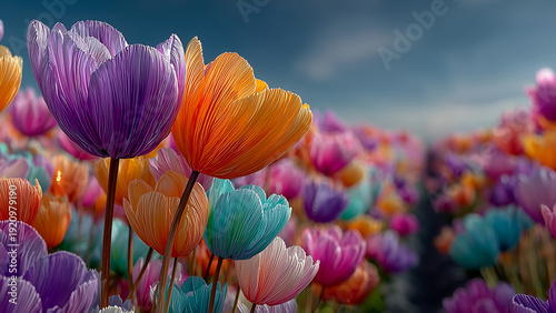 夜の闇の中で色とりどりに発光し並んで咲くチューリップ畑