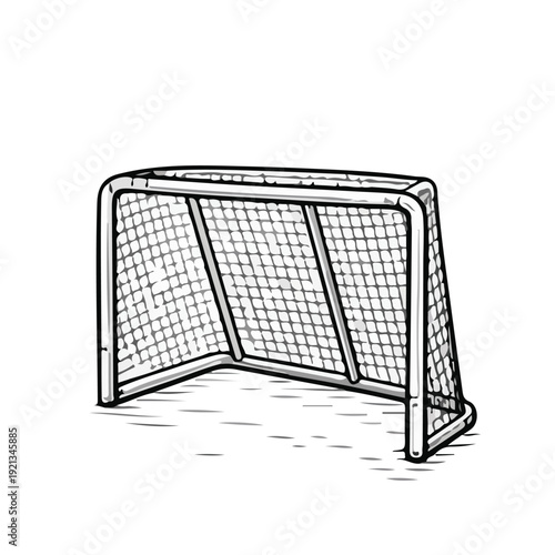 Detailed engraving style illustration of an empty ice hockey goal net with frame and netting, classic sports goal structure, black and white line art, isolated on white background.
