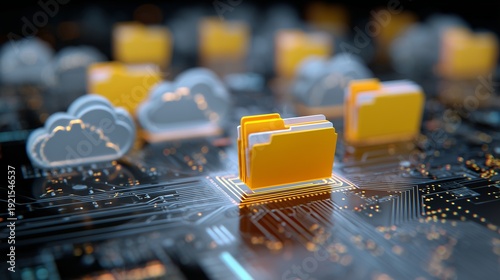 Circuit board with glowing folder and cloud icons representing data migration and file synchronization between on-premise and cloud systems.