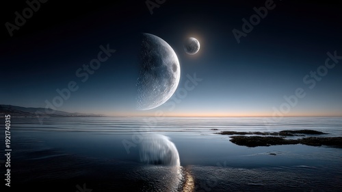 Two celestial bodies hang prominently over a calm sea surface at twilight