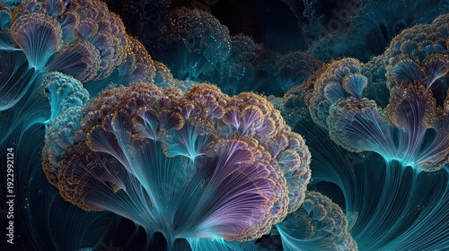 神秘的な微小世界や深海を思わせる、発光する有機的なフラクタル構造の抽象アート