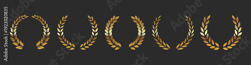 Gold laurels set. Foliate golden laurels branches. Laurel wreath silhouette. Trophy crest. Greek olive branch award, winner emblem. JPG image