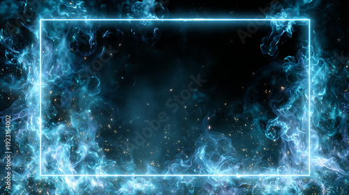 激しく燃え盛る青い炎と火花が舞う中にシアンのネオンフレームが浮かび上がる幻想的なエネルギー背景素材