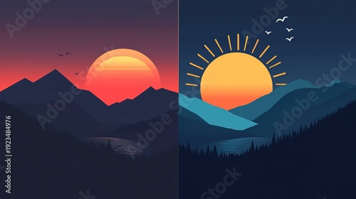 A stunning display of colors as the sun sets behind dark peaks, while a bright sunrise casts a warm glow on the opposite side, inviting new beginnings in the serene landscape