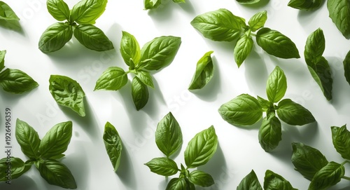 Wide view of fresh vibrant green basil leaves glowing against a white backdrop
